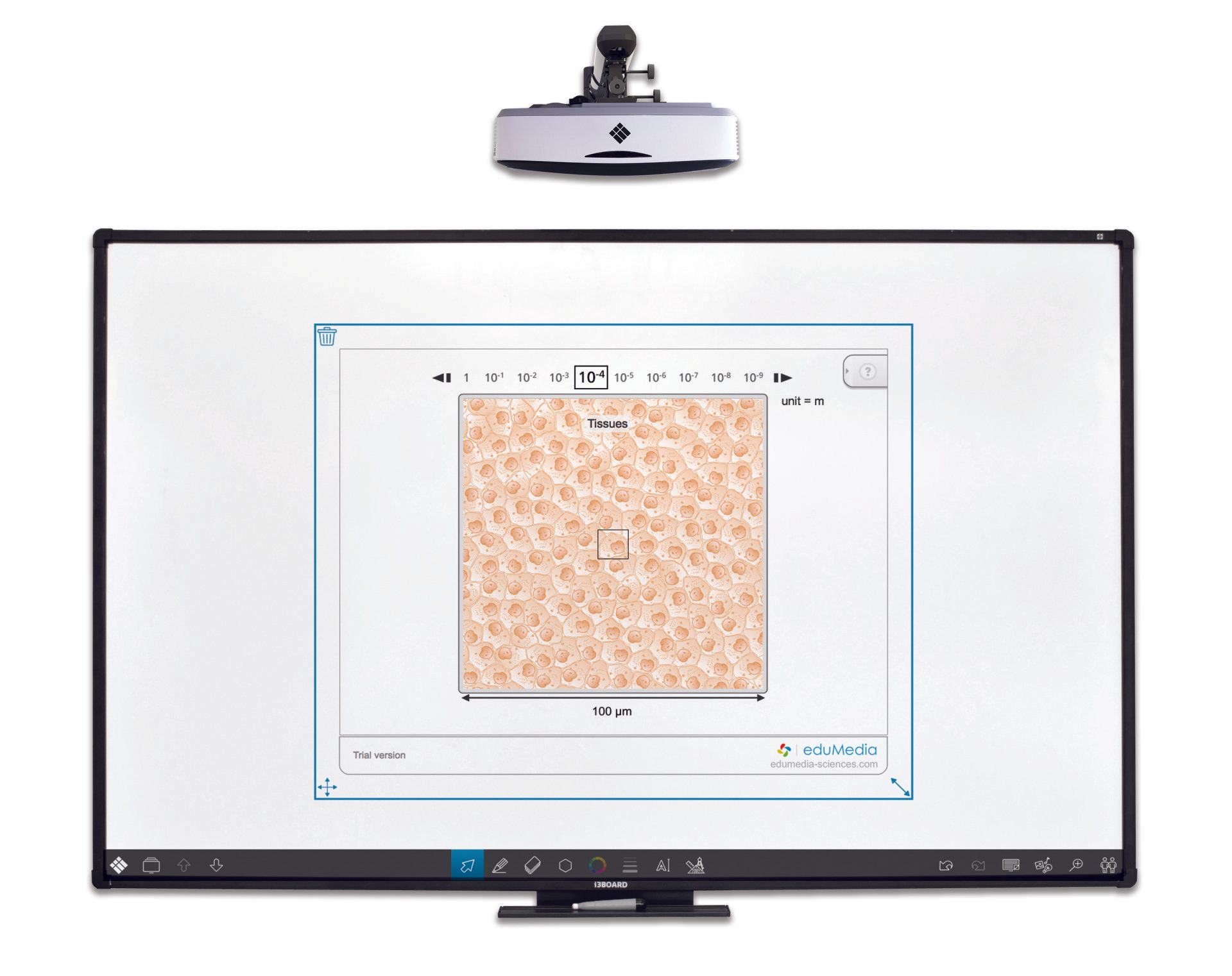 Il est associé à un vidéoprojecteur ultra courte focale installé au-dessus du tableau et qui projète l'image sur le tableau.